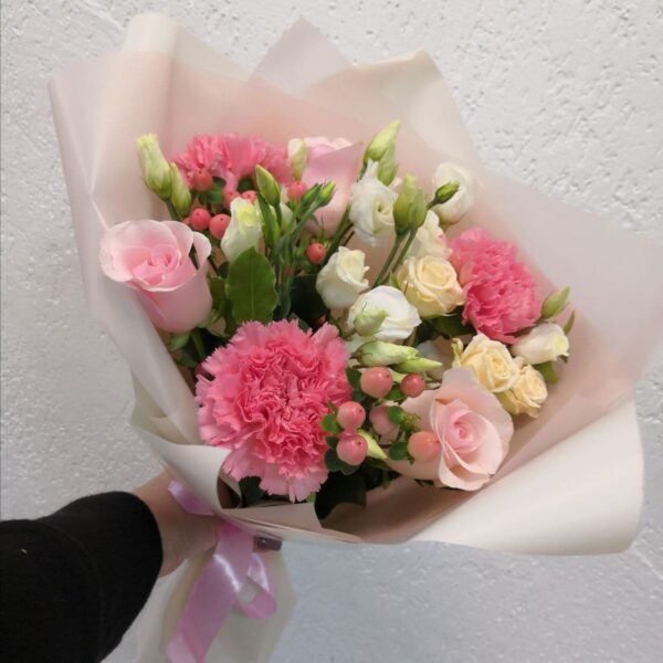 Букет из нежных роз и эустомы