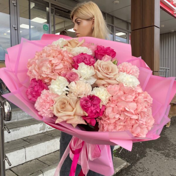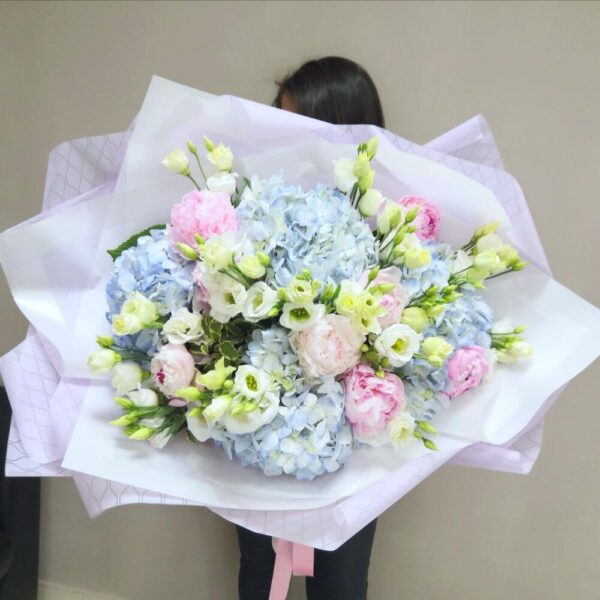 Авторский букет из гортензии и тюльпанов