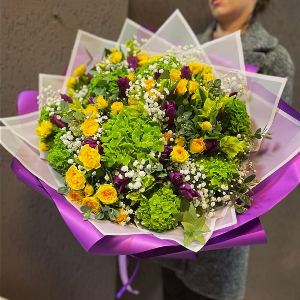 Авторский букет из гортензии и тюльпанов