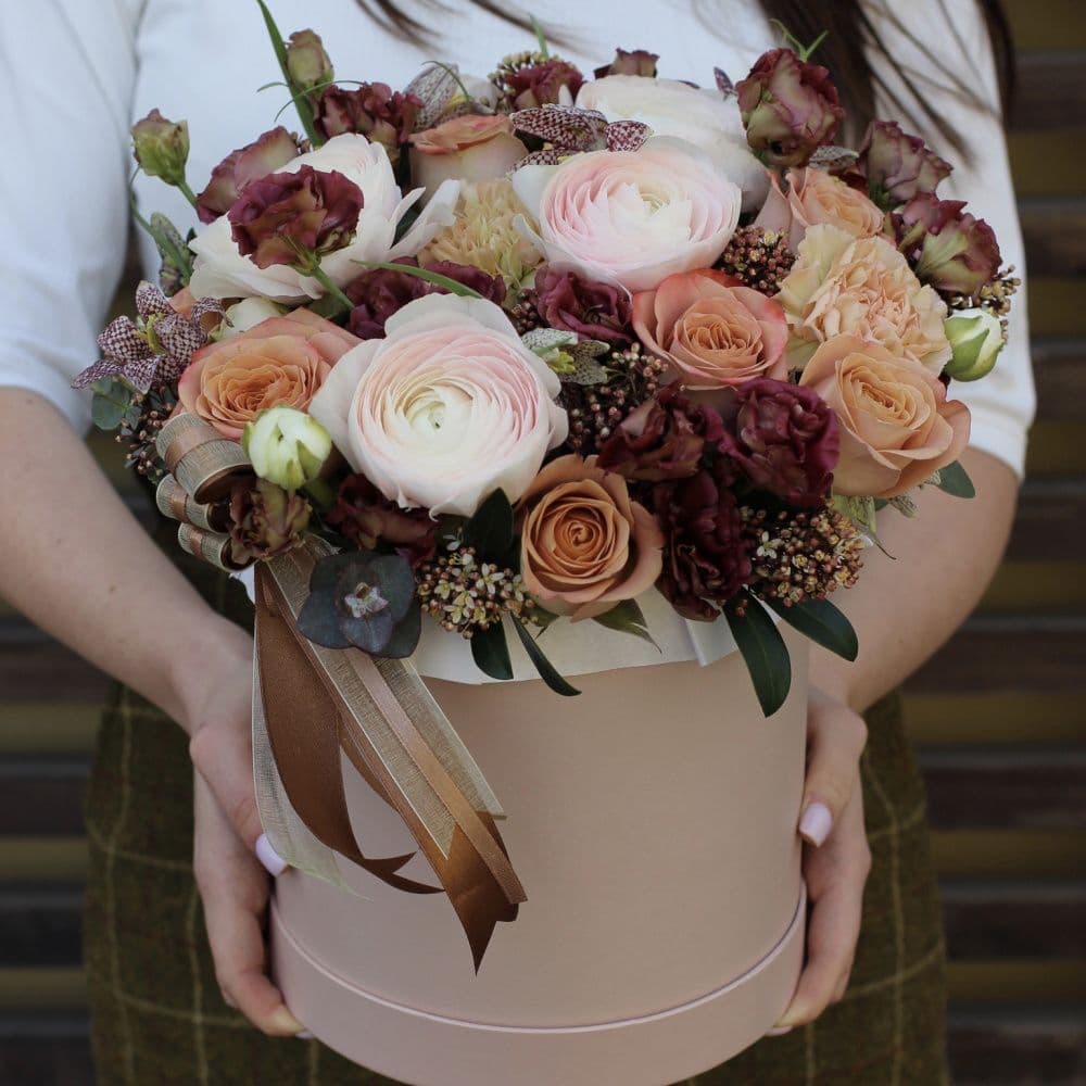 | Состав | Цветочная композиция выполненная в цилиндрическом боксе кофейного оттенка |