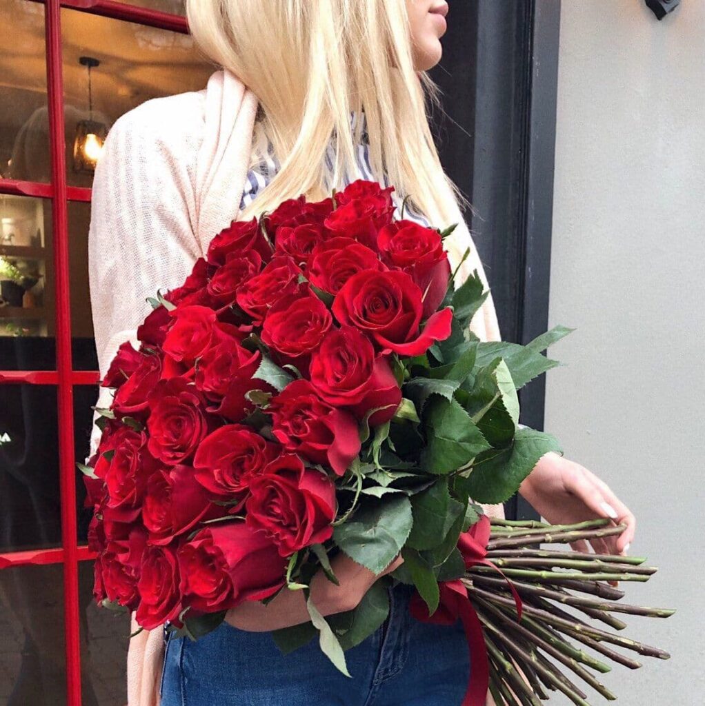 | Состав | Роза голландская 50см- 35шт., лента атласная. |
