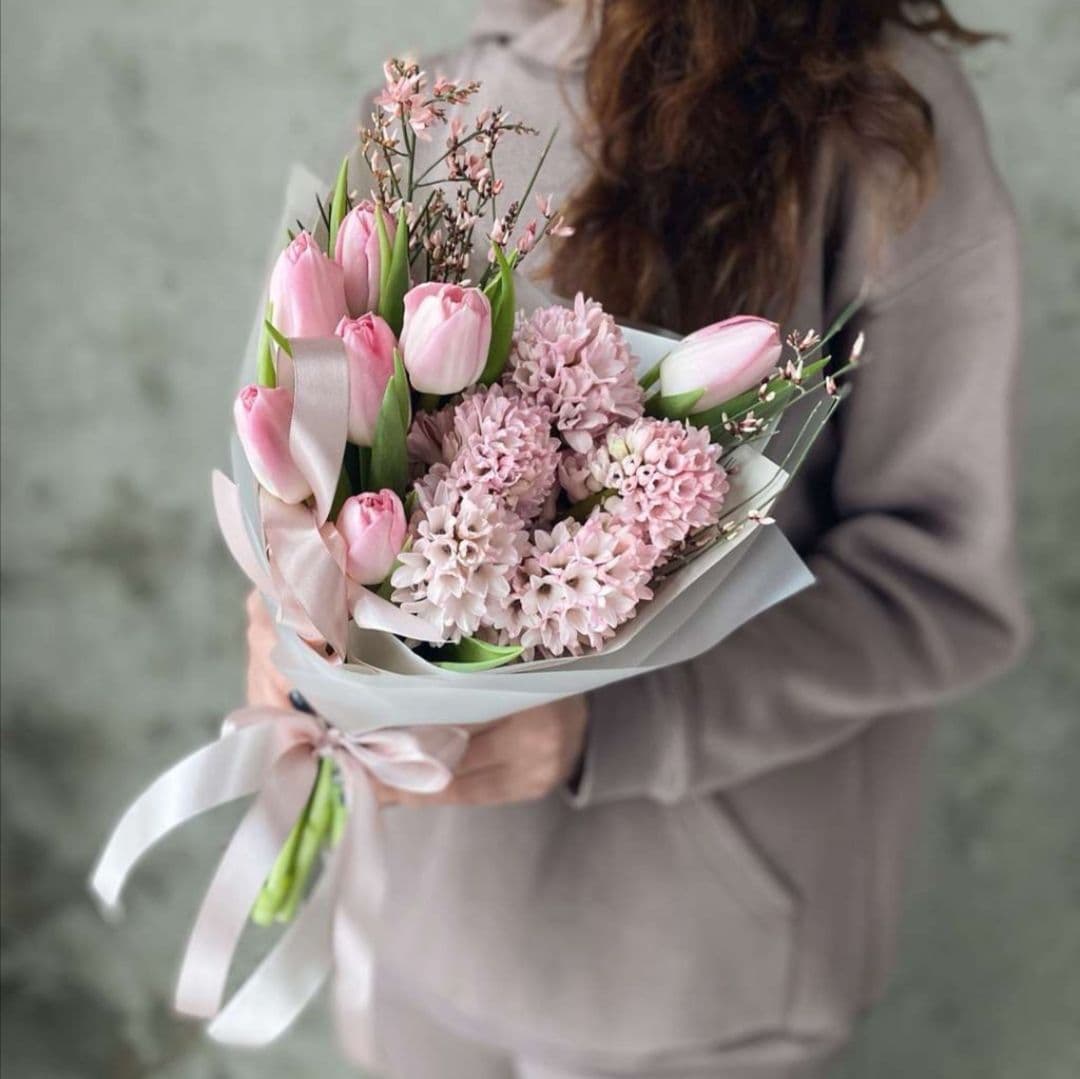 | Состав | Гиацинты, тюльпаны, ваксфлауэр. |