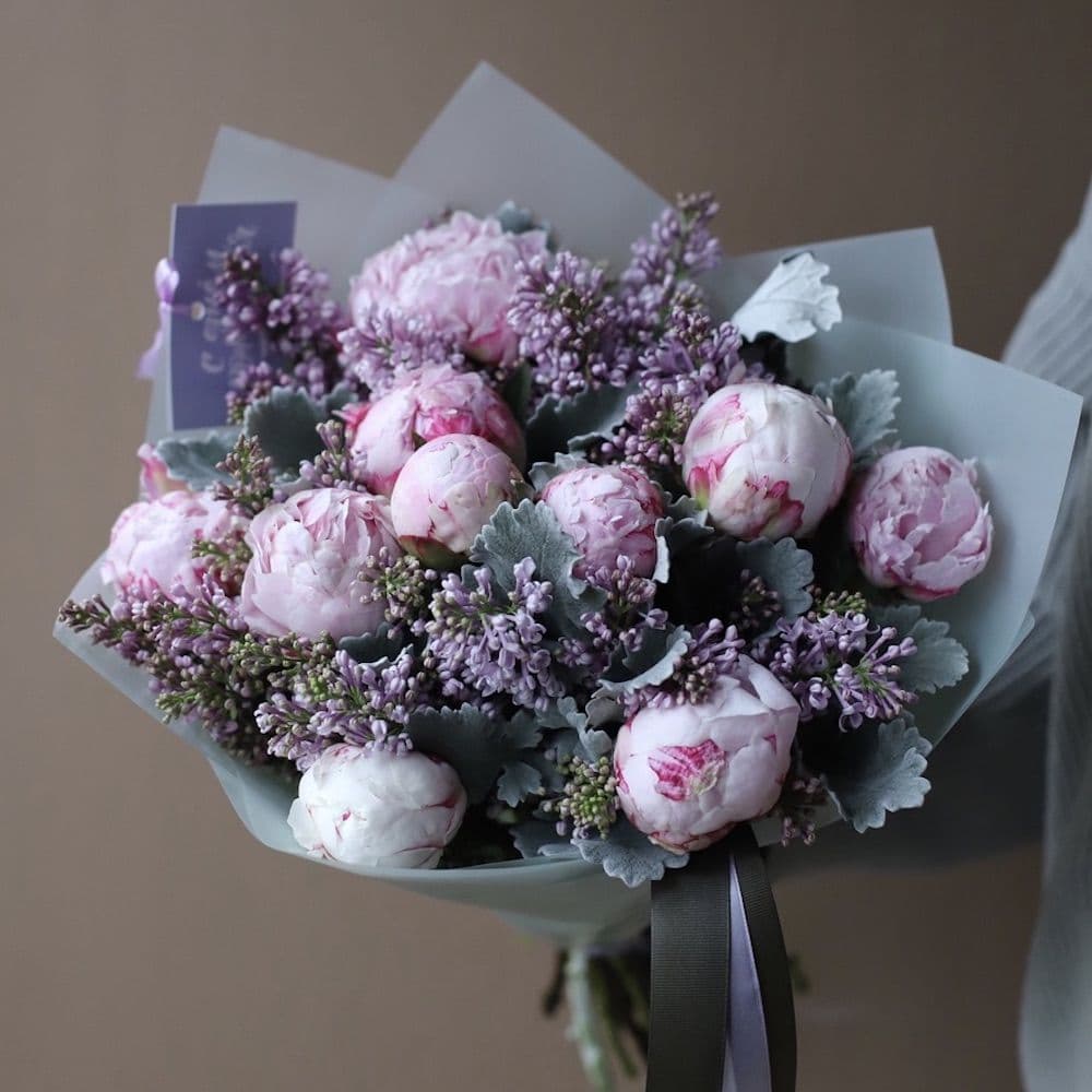 | Состав | Пионы Сара Бернар—11шт, сирень — 5шт, декоративная зелень-5шь, дизайнерская пленка-2шт |