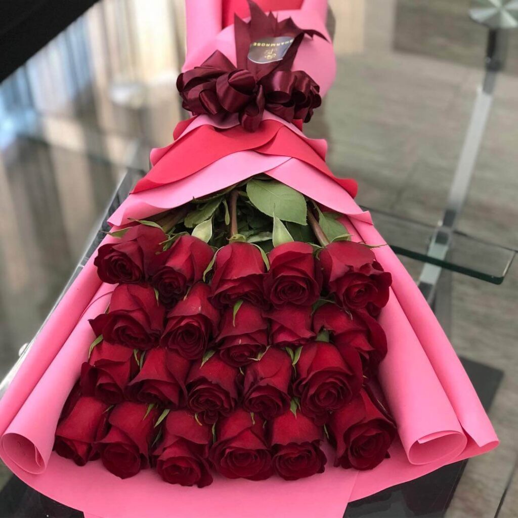| Состав | 21 красная роза, лента, дизайнерская упаковка |