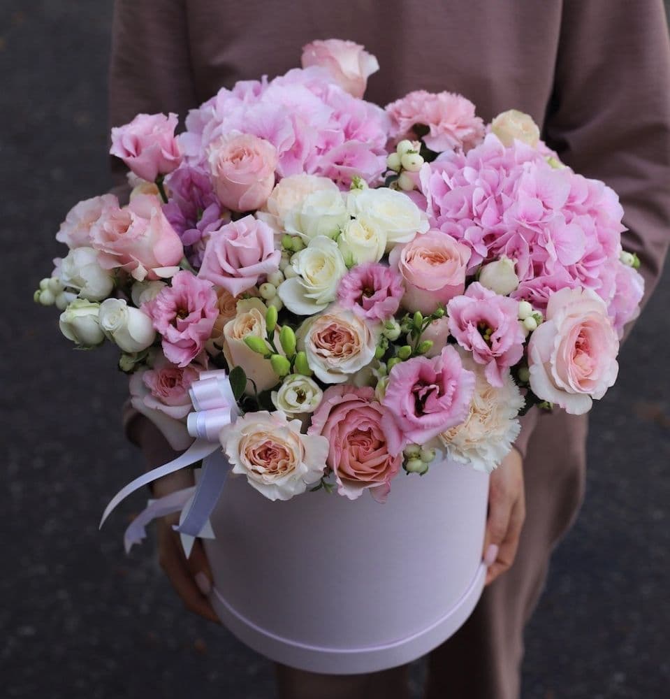 | Состав | Гортензия, пионовидная роза, Диантус, эустома, Фрезия, роза |