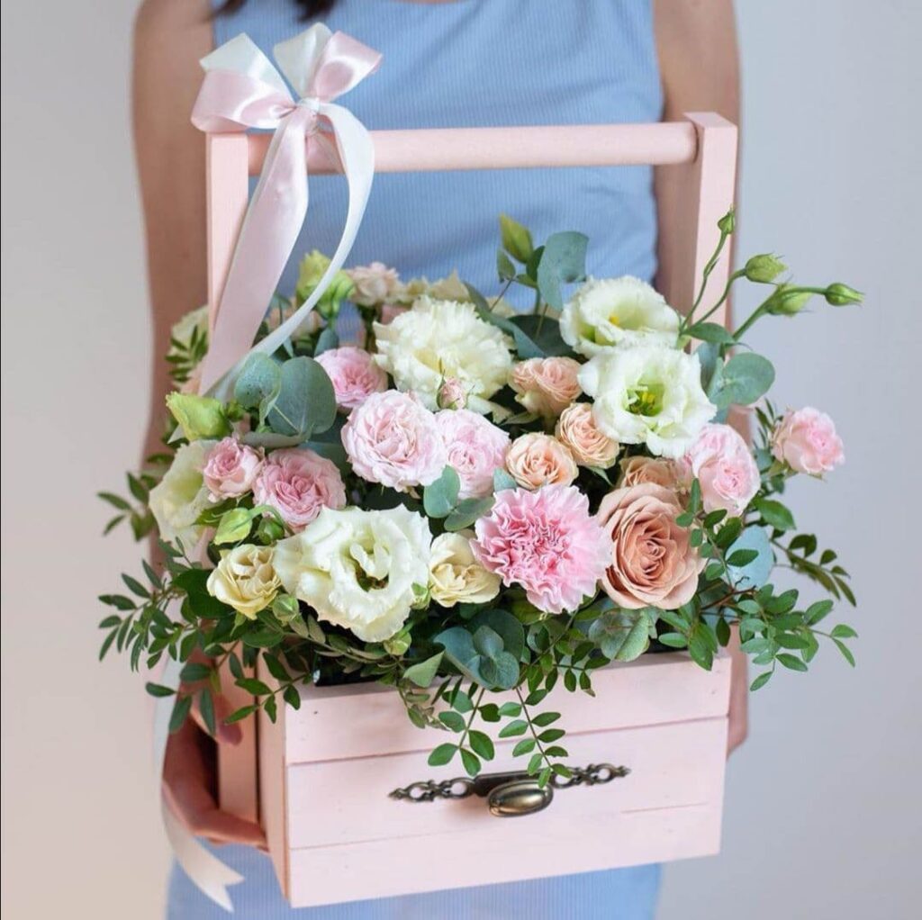 | Состав | Эустома, роза, кустовая роза, эвкалипт, Диантус. |
