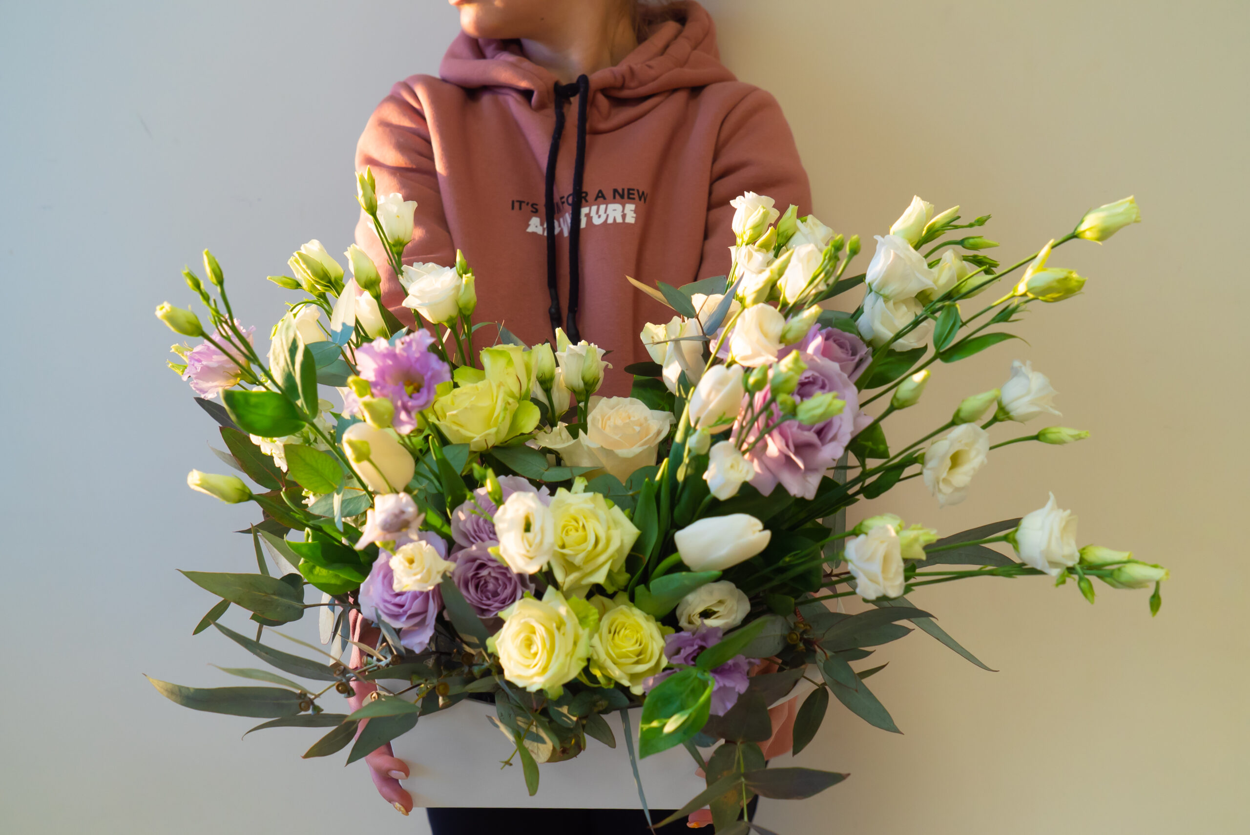 | Состав | Голландская роза, лизиантус, фрезия, кустовые розы и другие сезонные цветы |
