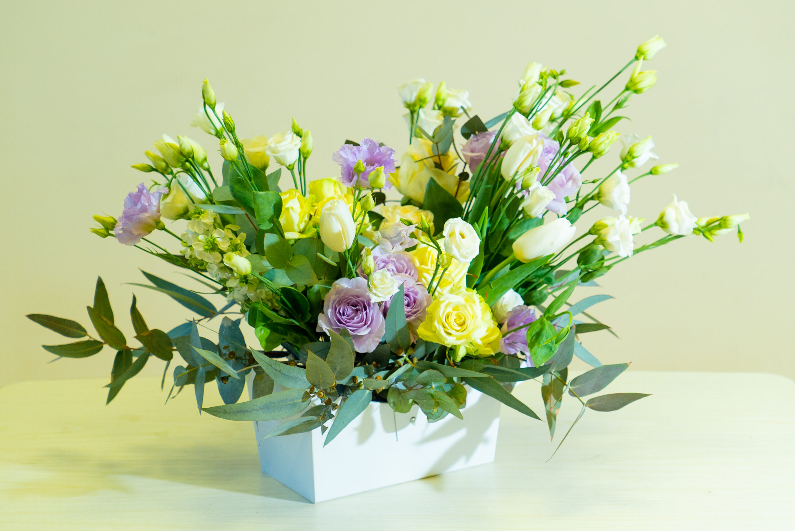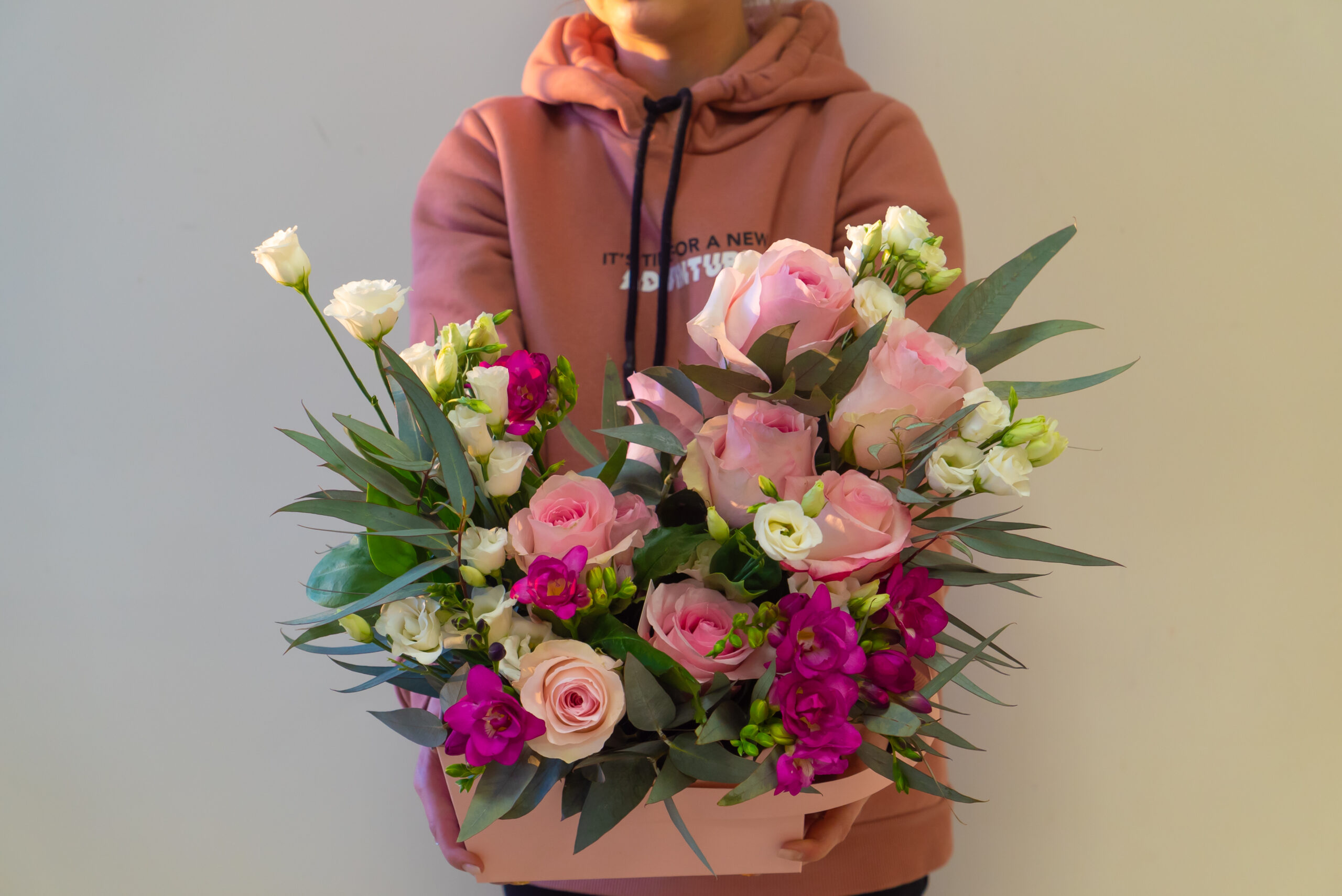 | Состав | Голландская роза, лизиантус, фрезия, кустовые розы и другие сезонные цветы |