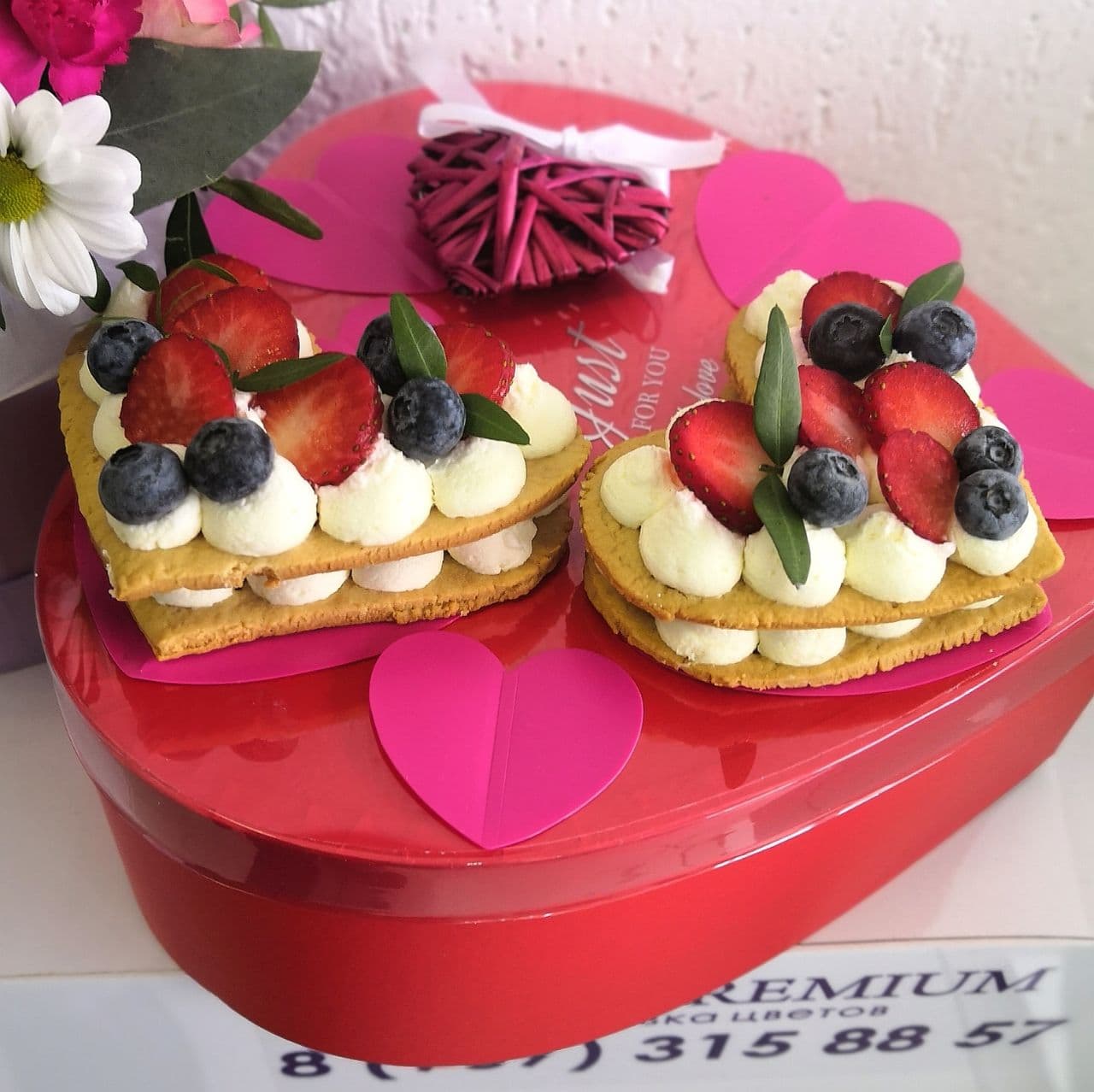| Состав | Основные компоненты: Нежные медовые коржи, прослойки карамели внутри и крем-чиз. Тортики украшены свежими ягодами, декором, зеленью фисташка. Упакованы в красивую подарочную коробку и перевязаны атласной лентой. |