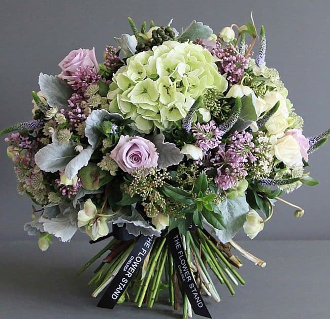 | Состав | Гортензия, Роза голландская, сирень, Вероника, Цинерария, декоративная зелень. |