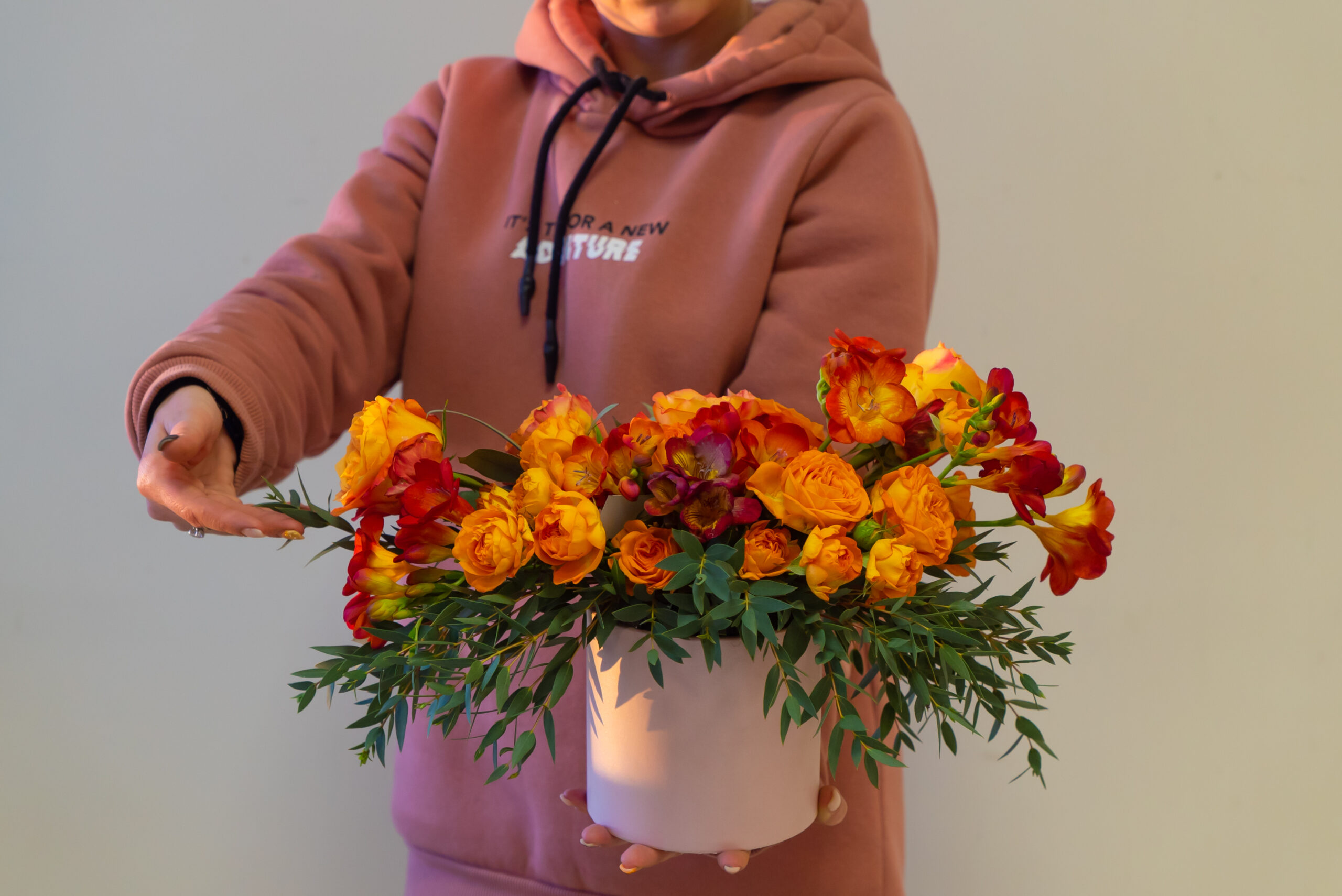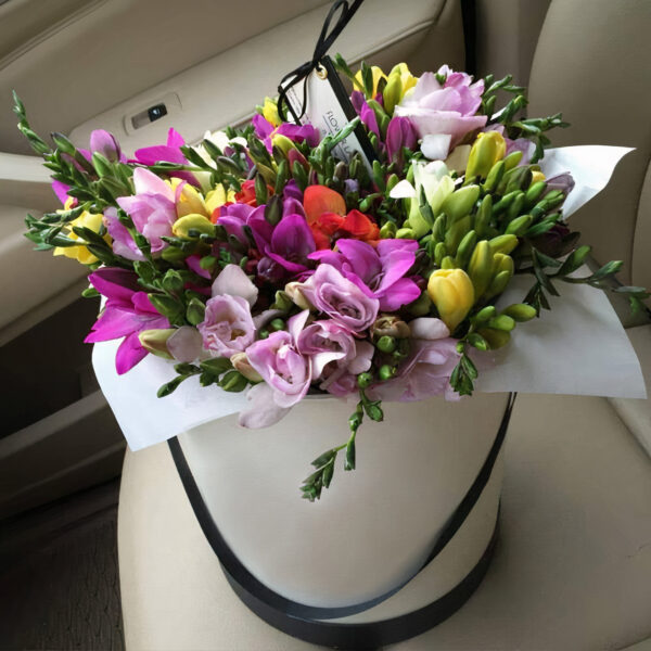 Упакуем букет в стильную фирменную коробку с крышкой, с полной защитой от перепадов погоды (жара, мороз, ветер или дождь — заказывайте букет в любую погоду)! Букет транспортируется в специальной силиконовой вазе, содержащей воду и встретит Вас свежестью и тонким ароматом. В комплекте с букетом мы прилагаем инструкцию по уходу за букетом и средство для продления жизни цветов. Получайте максимум от букета!