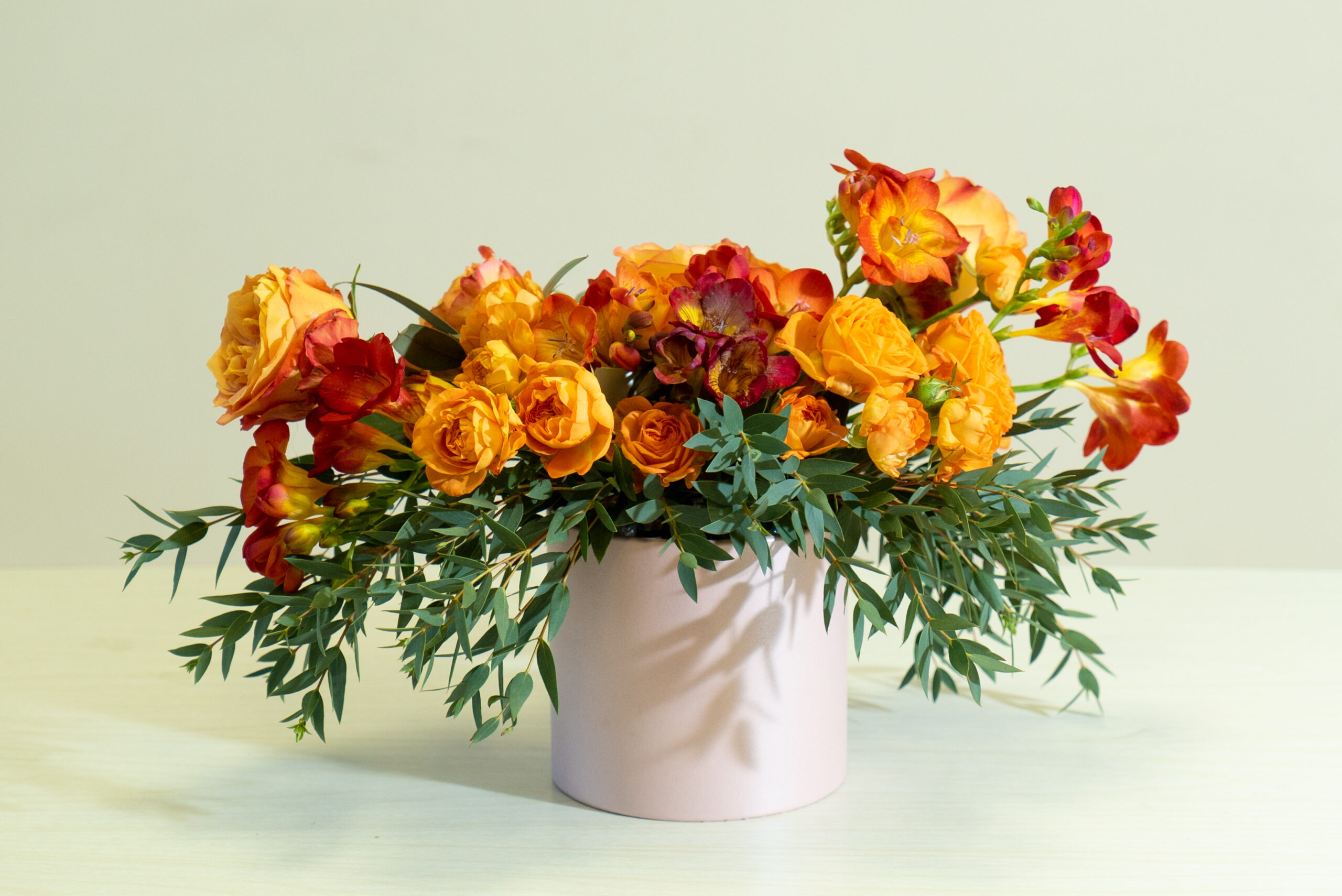 | Состав | Кустовая пионовидная роза фрезия и эвкалипт |